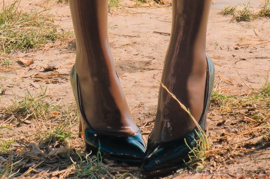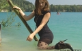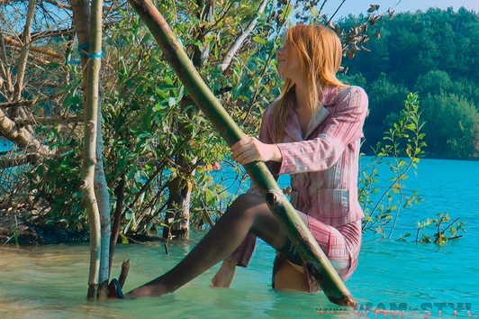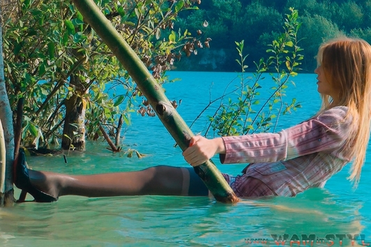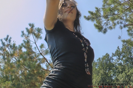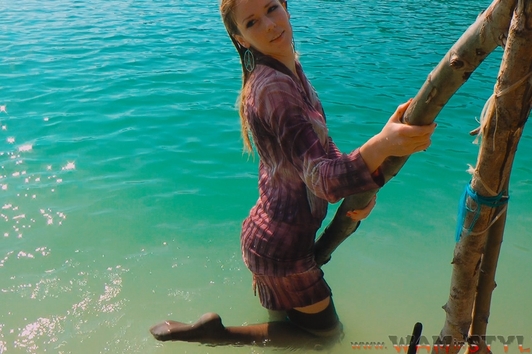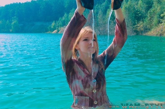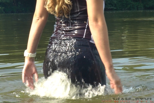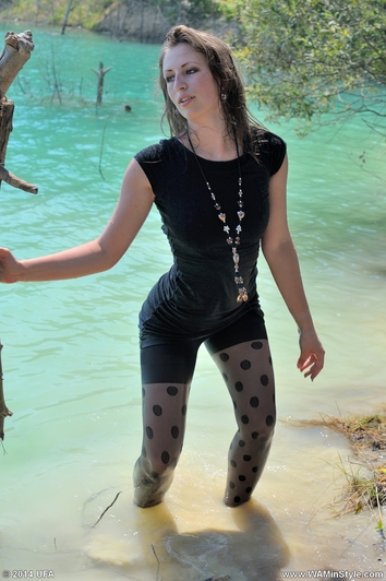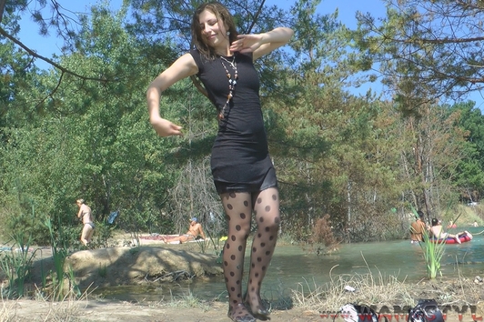 Elena is dancing on the river bank in a black short dress and pantyhose. Girl gets hot under the summer sun in black clothes and she continues her dancing slowly sinking into the water, fully dressed. Her wet look dancing looks even sexier than dry.