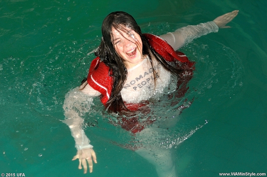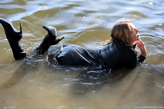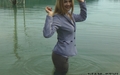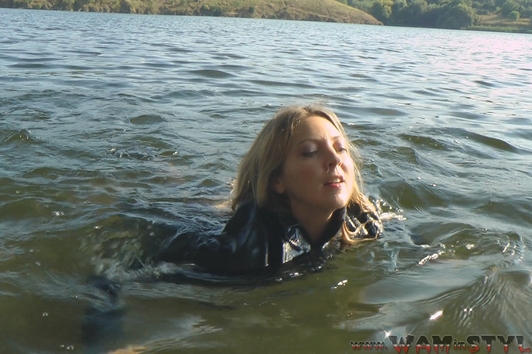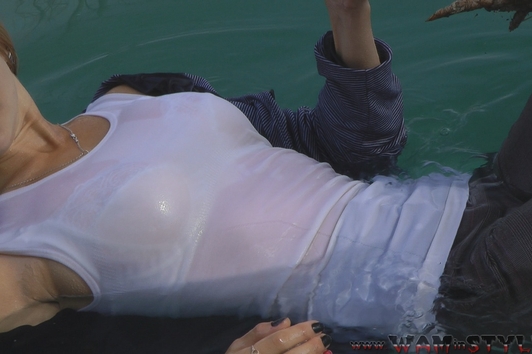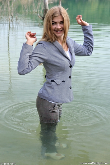 Victoria in elegant pantsuit comes into quiet water of cool lake. The girl did not even take off her shoes, so she submerged into the water fully clothed, enjoying soaking in wet clothes.