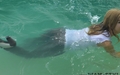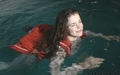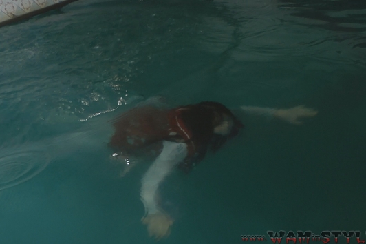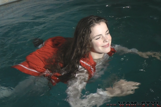 Greta swims in the pool fully clothed.