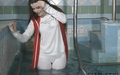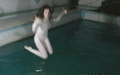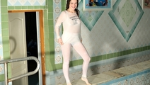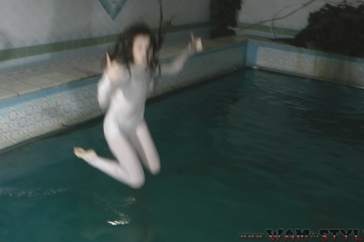 Vanessa in the business brown trouser suit bathes and dives in the pool. She also wears nylon light socks and shoes and black sleeveless blouse under jacket.