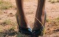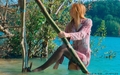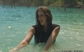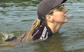 Vanessa gets wet in the cool water in the river fully clothed, wearing white pants, white socks, sandals and nice colored shirt. At the end girl poses in the river weed where her white pants and socks get dirty.