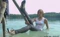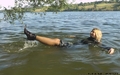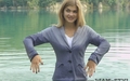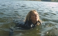 Victoria in a business suit swims in the lake.
