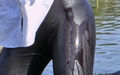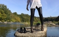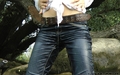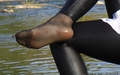 Vanessa gets wet in the cool water in the river fully clothed, wearing white pants, white socks, sandals and nice colored shirt. At the end girl poses in the river weed where her white pants and socks get dirty.